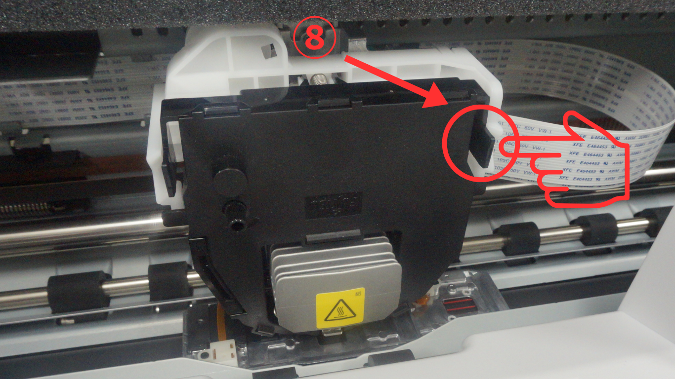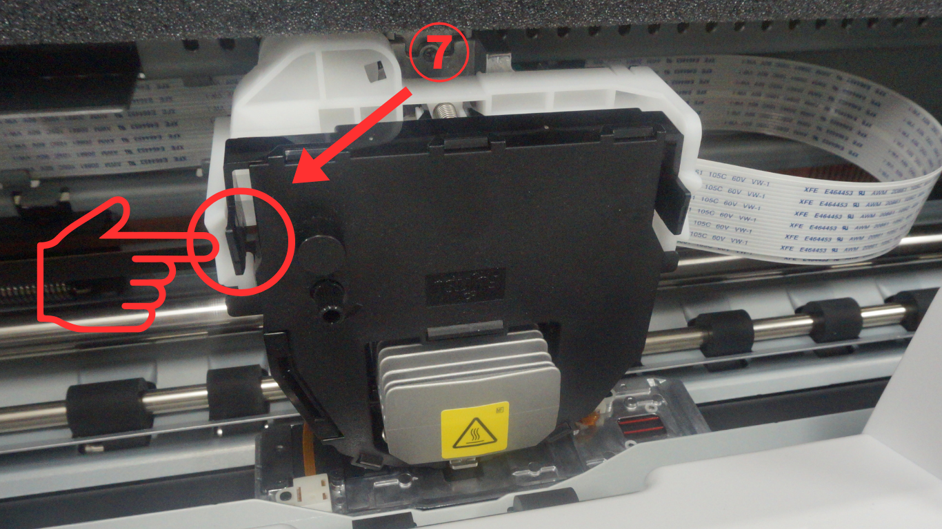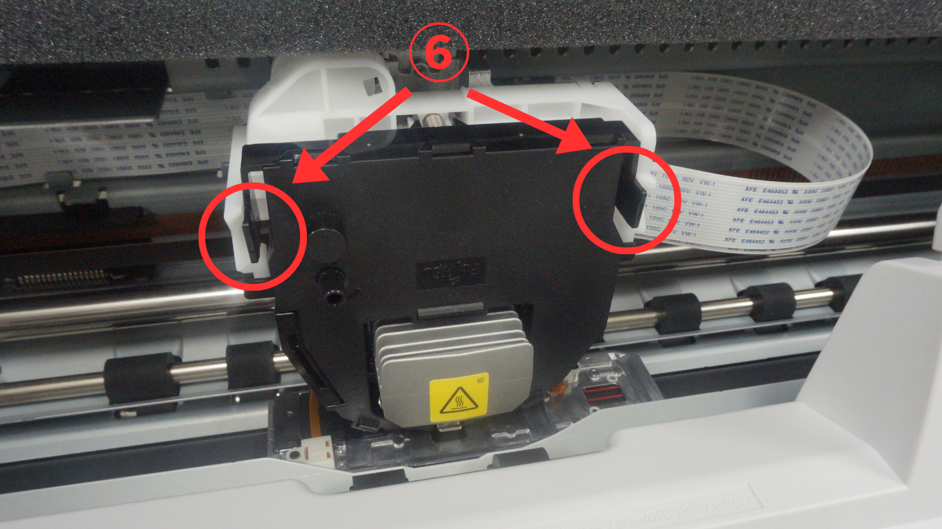⑥インクリボンは印字ヘッドに左右のフックで固定しています。フックを片方づつ外します。